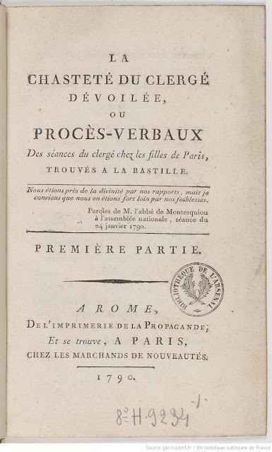 C’est entre fin février et début juin 1790 (difficile d’être plus précis, car l’ouvrage ne comporte pas d’achevé d’imprimer), que parut La Chasteté du clergé dévoilée, ou Procès-verbaux des séances du clergé chez les filles de Paris, trouvés à la Bastille – A Rome, de l’imprimerie de la Propagande, et se trouve à Paris chez les marchands de nouveautés.