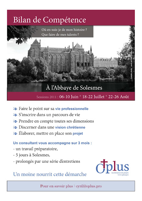 Sur cet encart, il est annoncé que « les moines de l’Abbaye de Solesmes accueilleront des personnes en session de bilan de compétences, les semaines du 18 au 22 juillet et du 22 au 26 août 2011« .