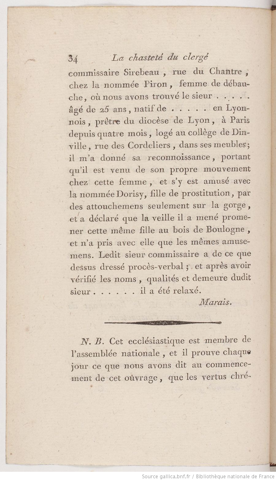 | Annexe 2 – Fin du rapport de l’inspecteur Marais et justification de l’anonymat de ce prêtre La Chasteté du Clergé dévoilée, tome II, p. 34 (Source BNF) |