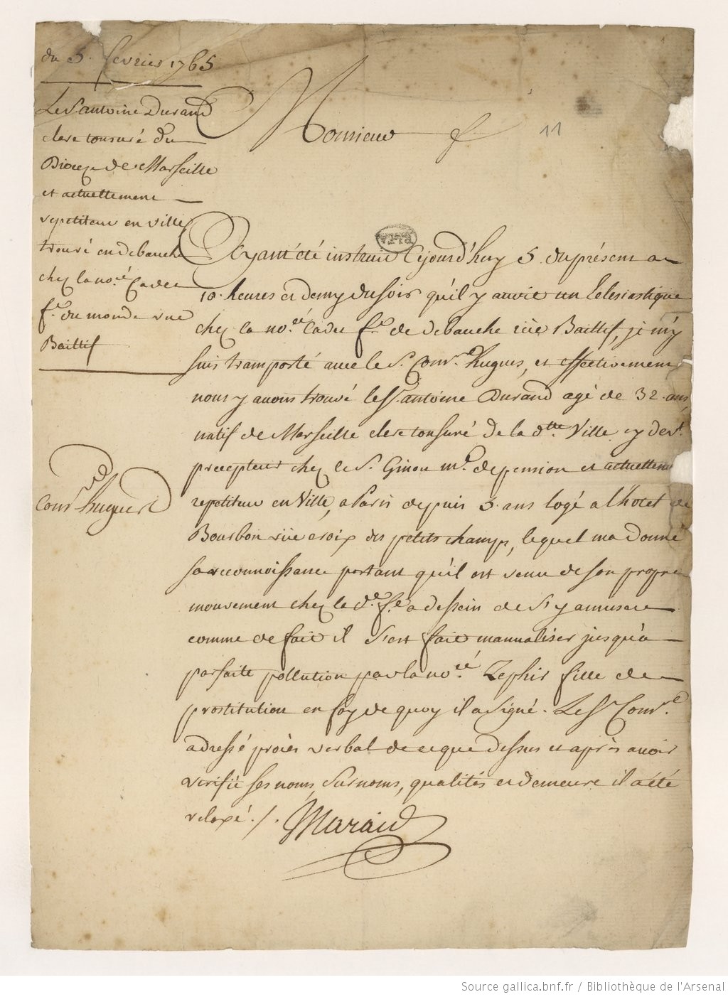 | Annexe 1 – Rapport de l’inspecteur Marais, 3 février 1765 Archives de la Bastille, Discipline des Moeurs, années 1765-1769 – BNF |