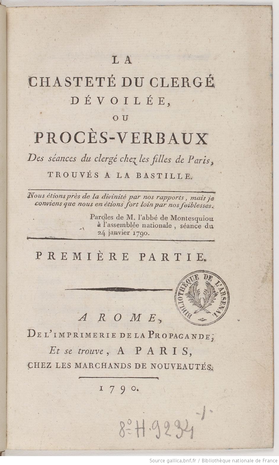 C’est entre fin février et début juin 1790 (difficile d’être plus précis, car l’ouvrage ne comporte pas d’achevé d’imprimer), que parut La Chasteté du clergé dévoilée, ou Procès-verbaux des séances du clergé chez les filles de Paris, trouvés à la Bastille – A Rome, de l’imprimerie de la Propagande, et se trouve à Paris chez les marchands de nouveautés.